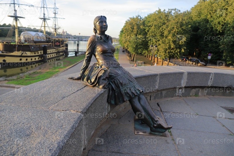 Памятник усталой туристке в Великом Новгороде на закате