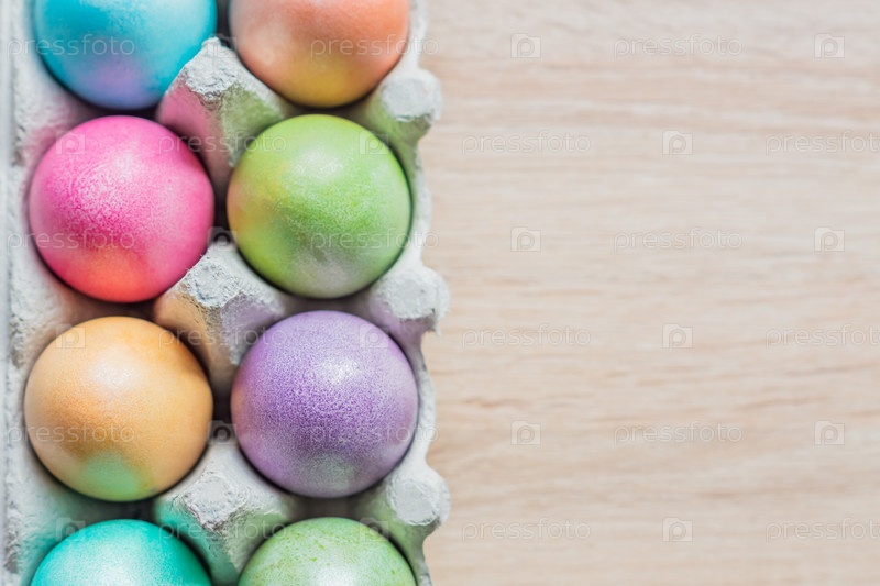Разноцветные пасхальные яйца в коробке. Вид сверху на деревянном фоне. Скопируйте место для вашего текста