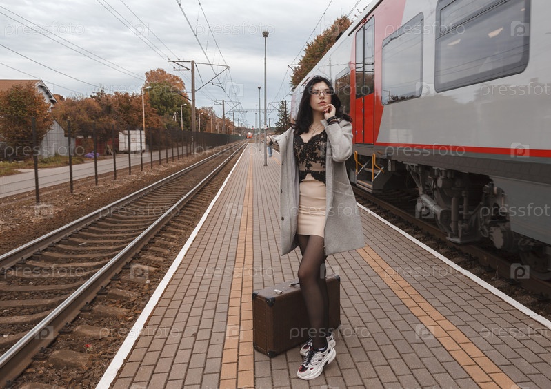 Молодая девушка в сером пальто с чемоданом стоит на вокзале