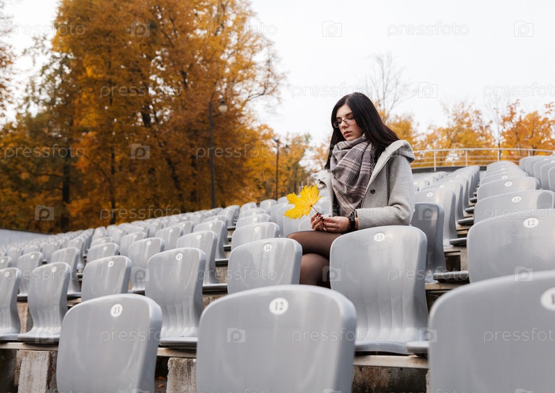 Маленькая девочка в сером пальто сидит на месте пустого стадиона