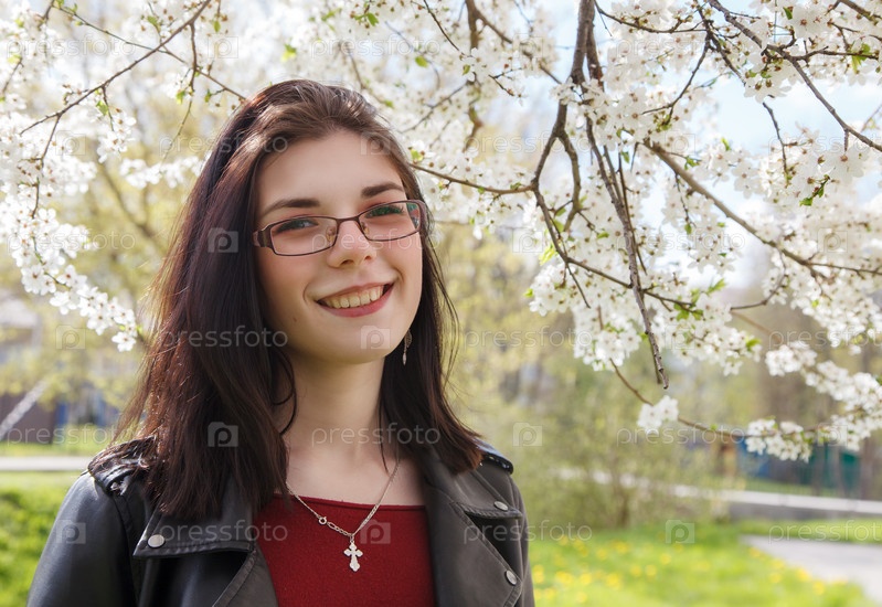 Портрет молодой красивой брюнетки в черной куртке и бордовом свитере, стоящей возле цветущей сакуры в солнечный весенний день. открытый крупным планом