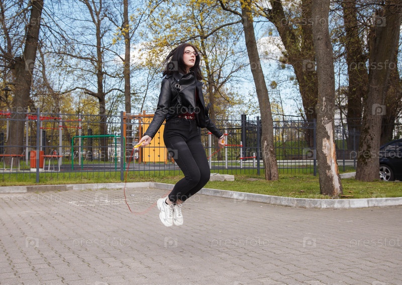 Молодая брюнетка в черной куртке и джинсах прыгает через скакалку на открытом воздухе в солнечный весенний день