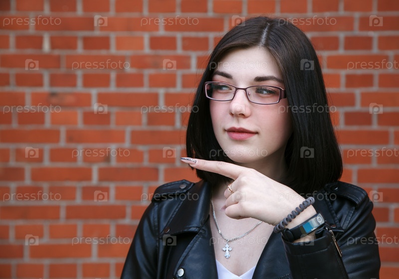 Позитивная красивая брюнетка в черной куртке указывает в сторону. представление вашего продукта. Открытый крупным планом на фоне кирпичной стены