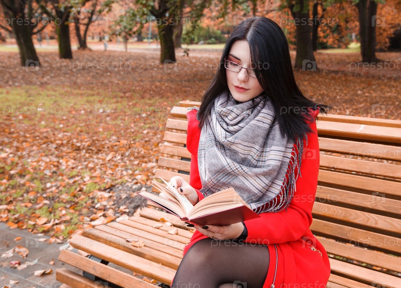 Молодая девушка читает книгу, сидя на скамейке в парке