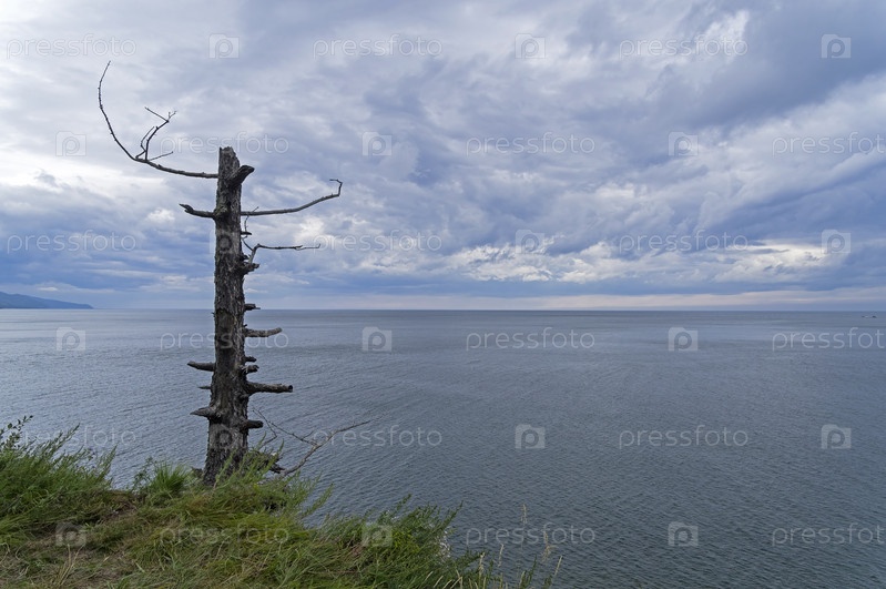 Ствол засохшего дерева на фоне красивой облачности над озером Байкал. Иркутская область, Россия. Август