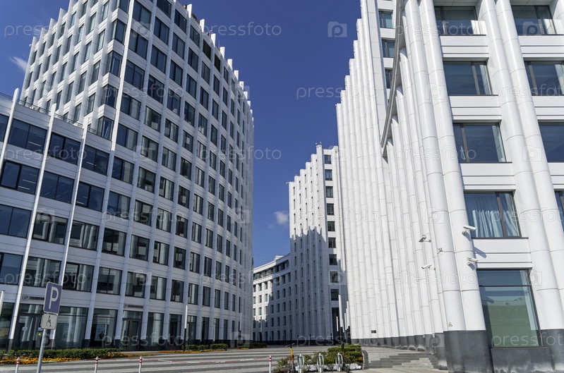 Современное офисное здание с дугообразным фасадом. Озерковская набережная, Замоскворечье, Москва. Солнечный день в июле