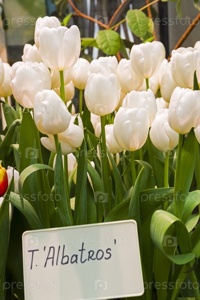 Тюльпаны сорта Albatros в оранжерее Аптекарского сада (филиал ботанического сада МГУ, Москва) Выставка 'Весенняя репетиция', 2019 год