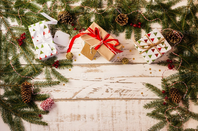 Новогодний или рождественский фон с праздничными коробками, еловыми ветками и шишками, покрытыми иконками. копия пространства