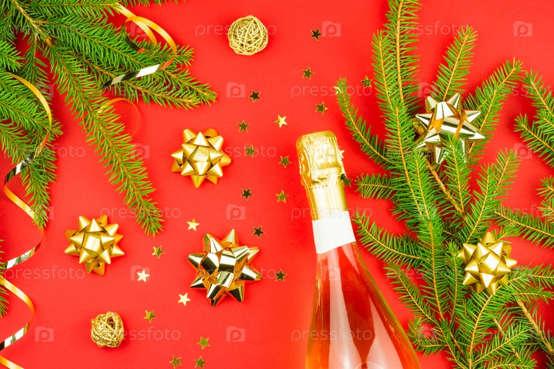 Новогодний красный рождественский фон с бутылкой шампанского, украшенный ветками ели, серпантином, конфетти. вид сверху