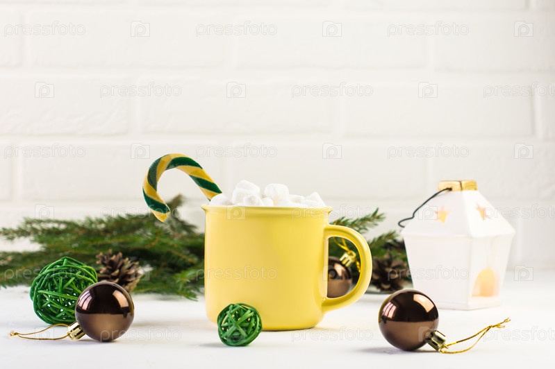 Новогодняя или рождественская композиция на белом фоне у стены. желтая деревенская кружка с какао и зефиром, горящая свеча и шарики