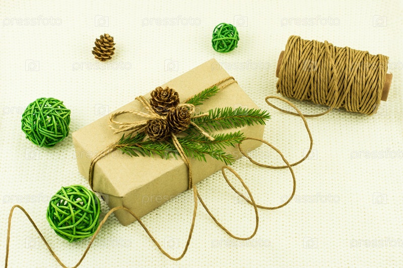 Новогодняя праздничная коробочка с подарком, украшенная своими руками и обернутая в крафт-бумагу. зеленые ветки ели, шишки, декоративные шары