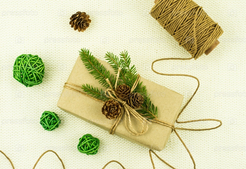 Вид сверху на вязаный белый фон с подарочной коробкой, украшенной лесными шишками и ветвями. Рождественский декор