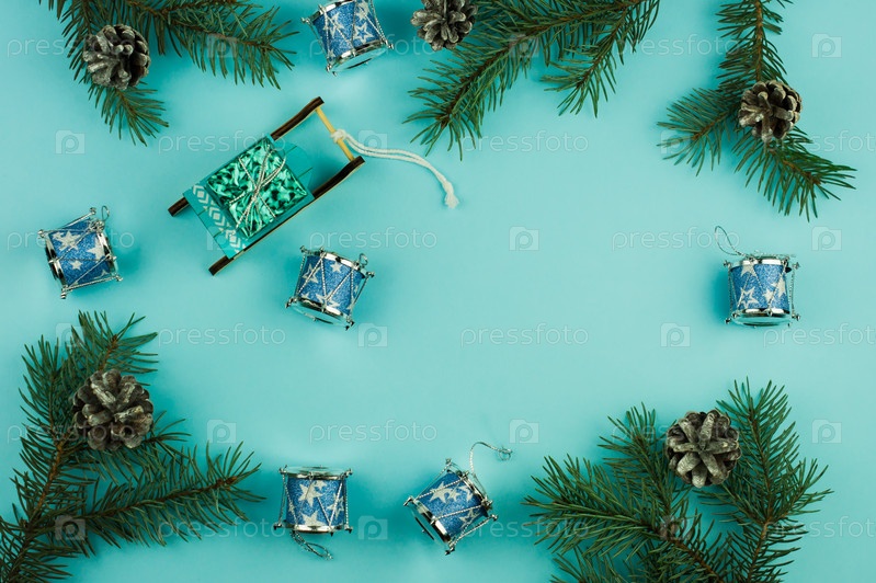 Синий новогодний фон с еловыми ветками и шишками, елочные игрушки для декора, санки с подарком, традиционные рождественские барабаны. вид сверху