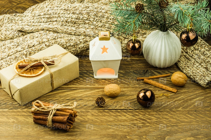 Новогодняя композиция с подарочными коробками из крафта, свечой в подсвечнике-фонарике, теплым вязаным свитером. орехи, корица, дольки апельсина