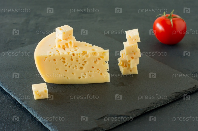 Сыр Радамер на фоне черного бетона. треугольный кусок желтого швейцарского сыра из коровьего молока с дырочками
