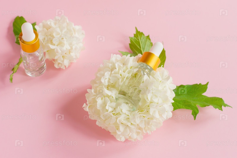 Две стеклянные бутылки-капельницы для медицинского и косметического применения и белые нежные цветы на светло-розовом фоне. Концепция ухода за кожей и СПА