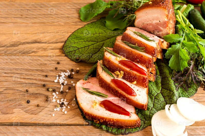 Нарезанная жареная грудинка барбекю на деревянном столе с кетчупом и зелеными овощами