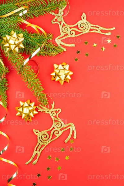 Вертикальный красный новогодний фон с еловыми ветвями, золотыми оленями, звездами конфетти, серпантином. вид сверху