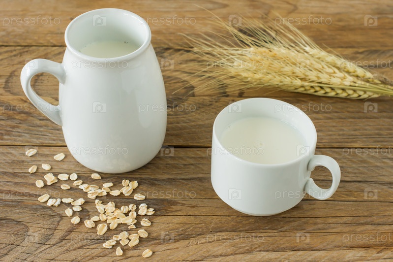 Овсяное молоко в стеклянном кувшине и овсянка в чашке на деревянном столе