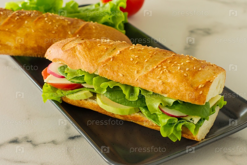 Веганский сэндвич из цельнозернового длинного багета с листьями салата, авокадо, помидорами и сыром. Здоровый перекус и еда на вынос