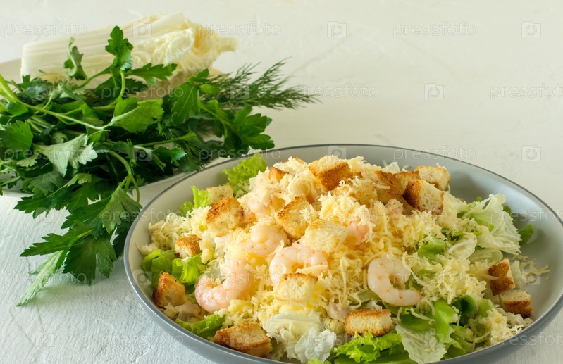 Домашний салат Цезарь с креветками, пармеза, соусом и гренками на белом фоне