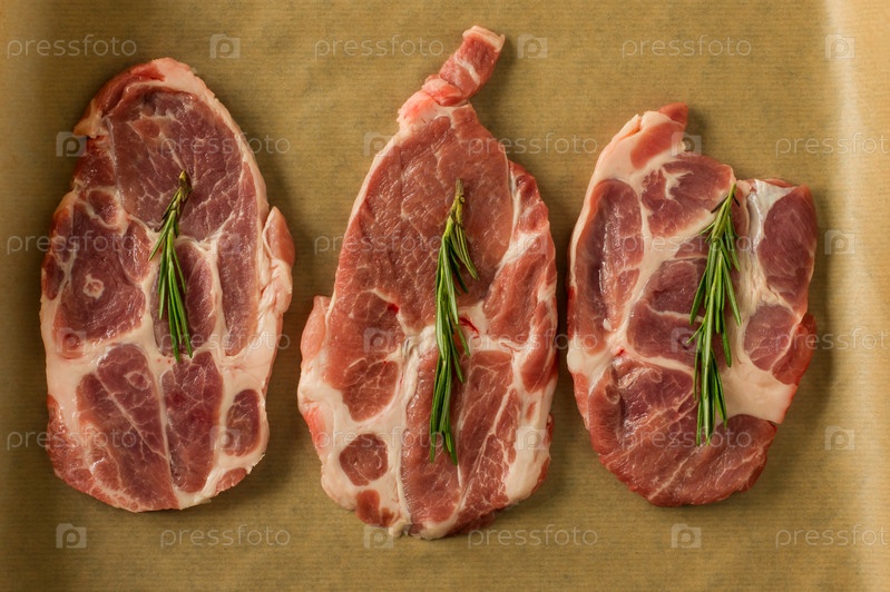 Вид сверху на свежие нарезанные стейки из свинины с розмарином на бумаге для выпечки, готовые к приготовлению. Кулинария и кулинария