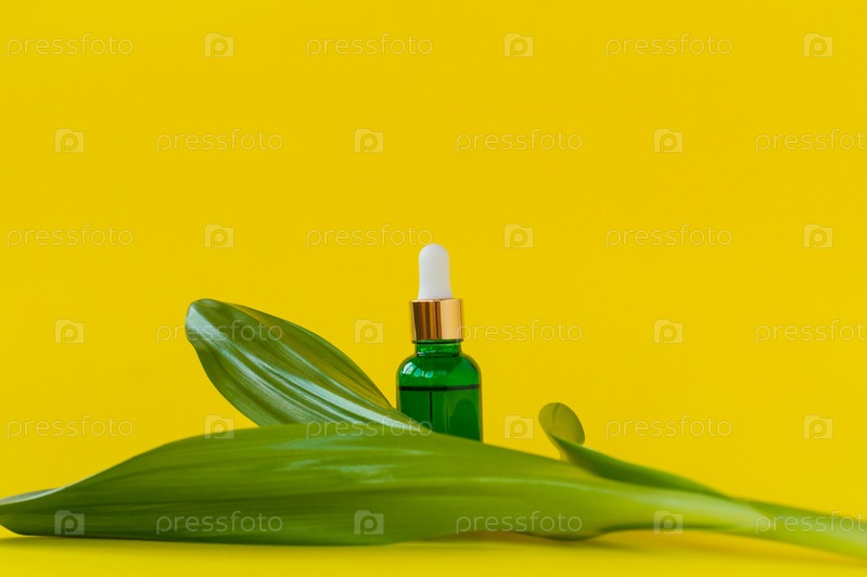 Натуральный контейнер для бутылок по уходу за кожей и органический зеленый лист на желтом фоне. Концепция домашних средств и косметических средств