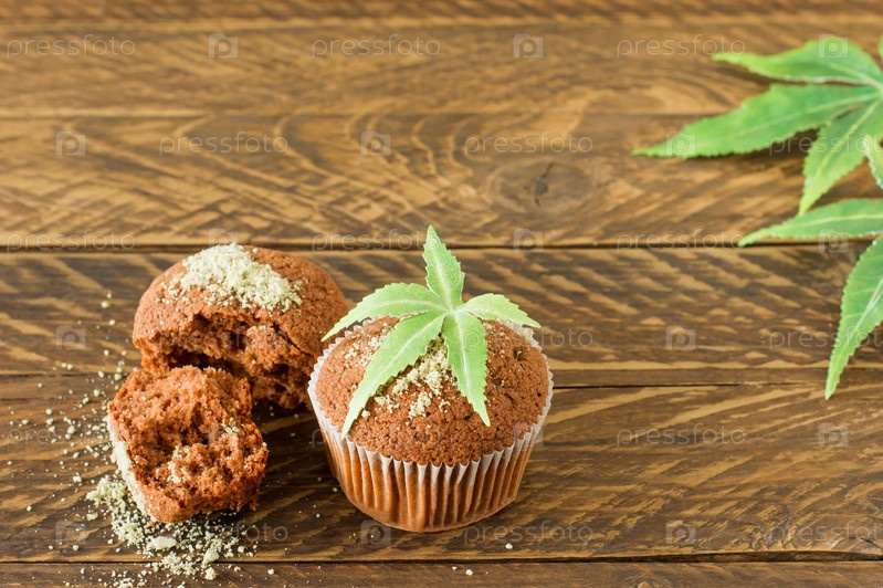 Здоровые и вкусные веганские и безглютеновые кексы с семенами конопли на белой тарелке на деревянном столе. Кексы с марихуаной и листьями конопли