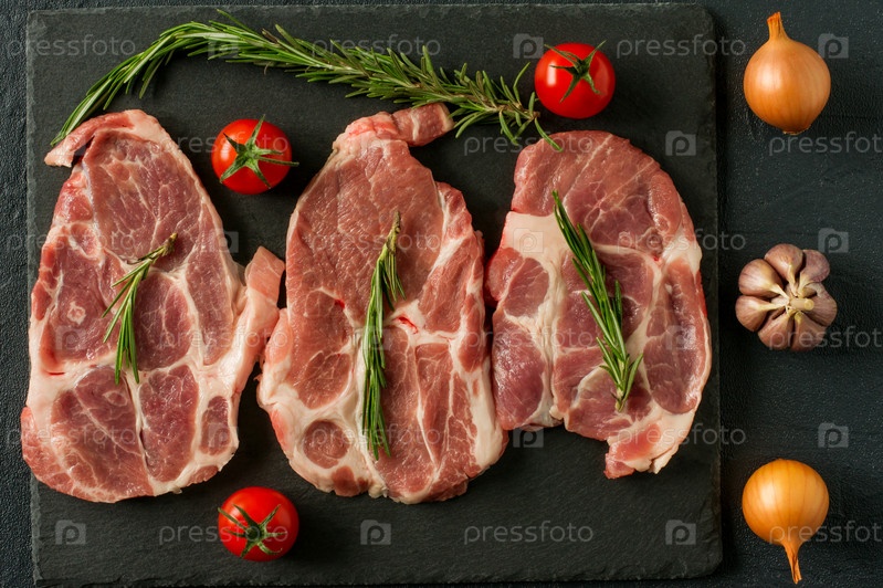 Еда органическая свежая сырая свиная шея на черном сланцевом камне с розмарином, луком и помидорами