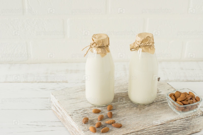 Домашнее миндальное молоко в стеклянных бутылках с миндалем на деревянном столе