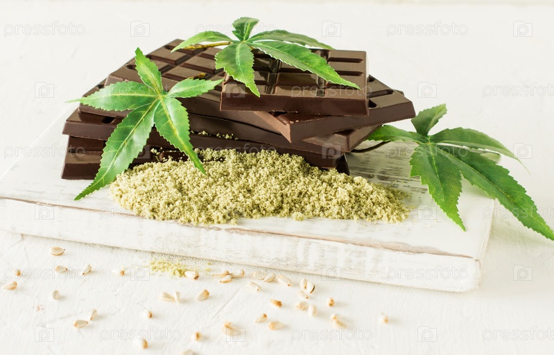 Листья марихуаны и темный шоколад на белом фоне