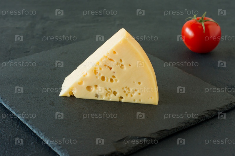 Сыр Радамер на фоне черного бетона. треугольный кусок желтого швейцарского сыра из коровьего молока с дырочками