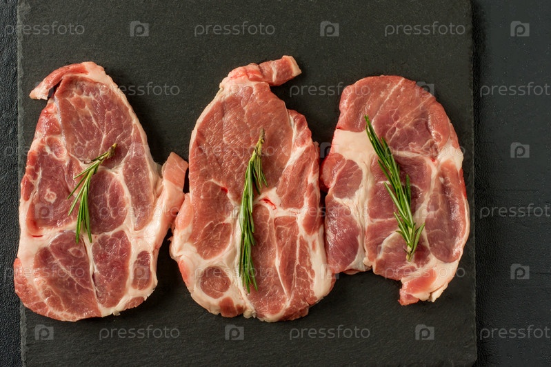 Свежее сырое мясо со специями и розмарином и красным перцем на черном сланце, на темном фоне, свинина, говядина, филе костей