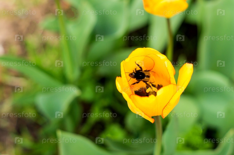 Медоносная пчела с корзиной для пыльцы летит над желтым цветком тюльпана