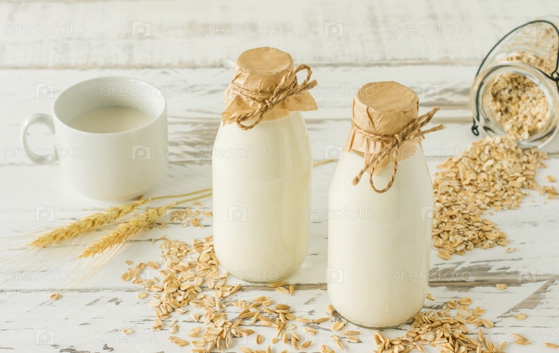 Овсяное молоко в стеклянных бутылках и овсянка в чашке на деревянном столе
