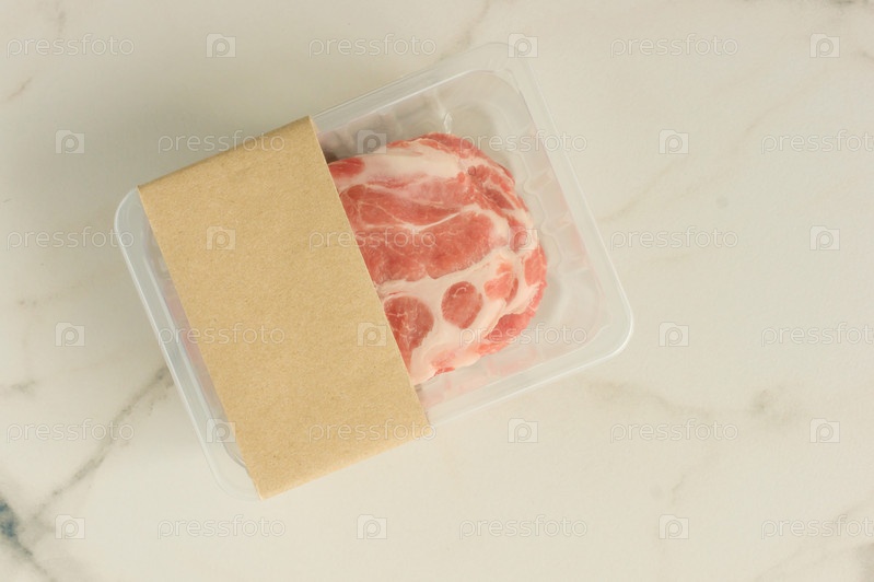 Вакуумные стейки из сырой свинины упакованы на мраморном фоне, вид сверху, макет для дизайнеров
