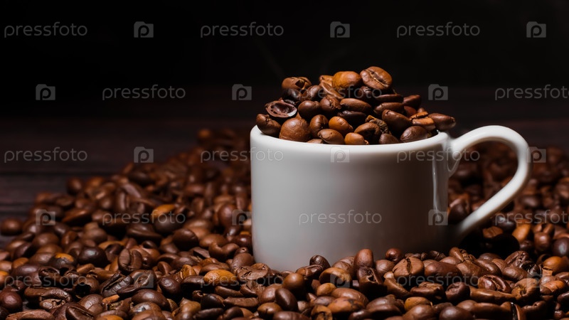 Белая кофейная чашка, наполненная кофейными зернами, стоит среди большого количества зерен, на темном фоне