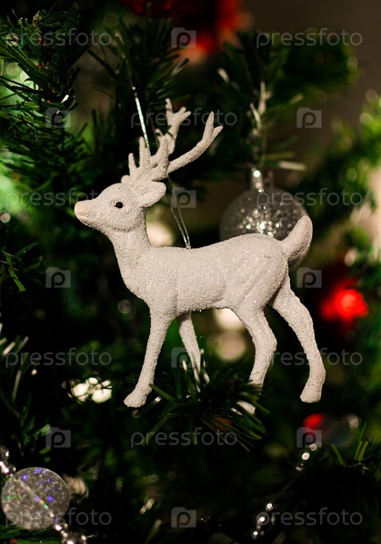 Новогодняя и рождественская открытка с оленем. Рука держит игрушку оленя возле елки