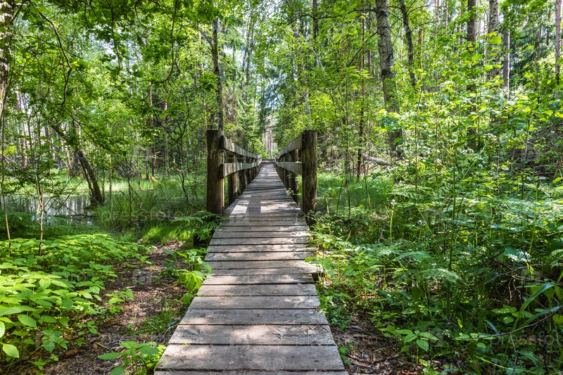 Деревянная тропа, ведущая по болоту, окруженному лесом. Заболоченная земля и заболоченная местность, топь, трясина