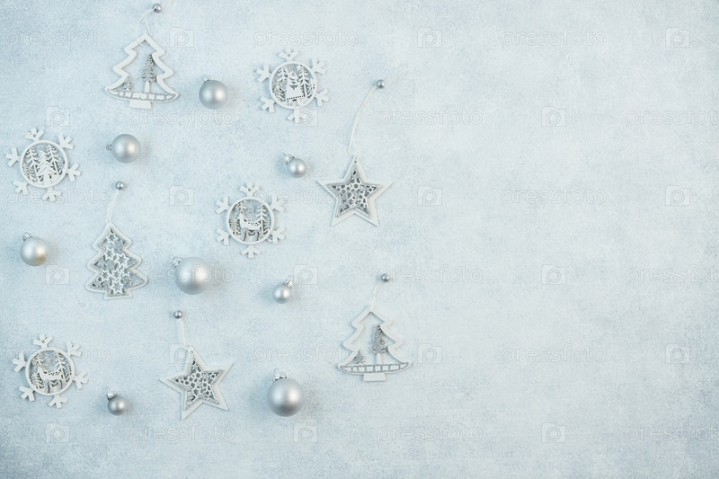 Концепция праздничного фона в серебристых тонах. Вид сверху на серебряные шарики из подарочной коробки на сером фоне. Макет фона новогодних праздников с местом для копирования