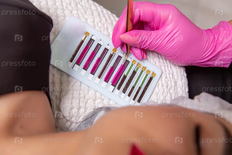 Процедура наращивания ресниц. Инструмент для наращивания ресниц крупным планом. Профессиональный стилист, удлиняющий женские ресницы. Мастер и клиент в салоне красоты