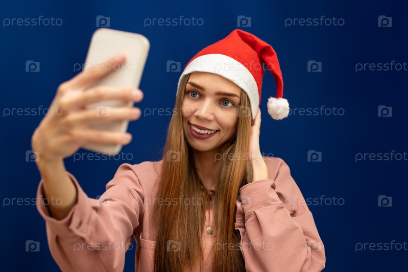 Девушка в шапке Санта-Клауса на изолированном синем фоне фотографируется на свой телефон