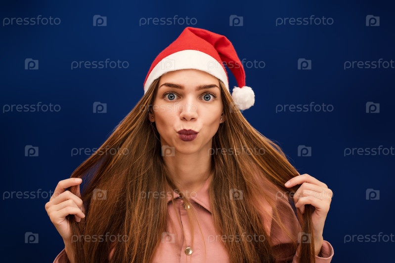 Девушка в шапке Санта-Клауса на изолированном синем фоне посылает поцелуй