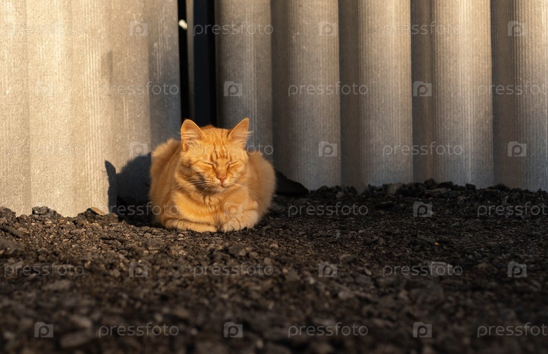 Бездомный рыжий кот спит на улице и греется на солнышке. Концепция бездомных животных