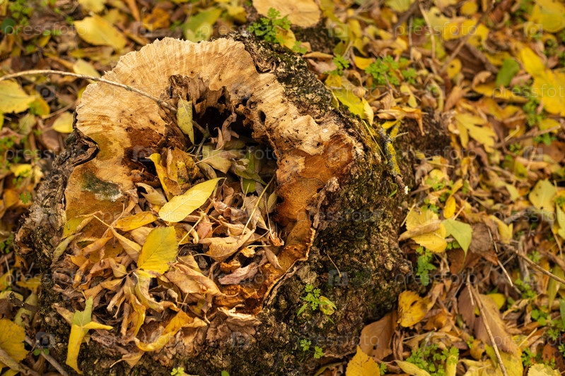 Старый осенний пень в лесу, заваленный листьями. Яркие краски осенней природы
