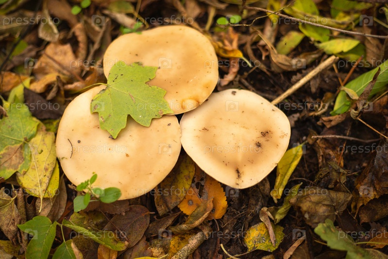 Грибы, растущие в осеннем лесу, с кленовым листом на шляпе. Опавшие листья