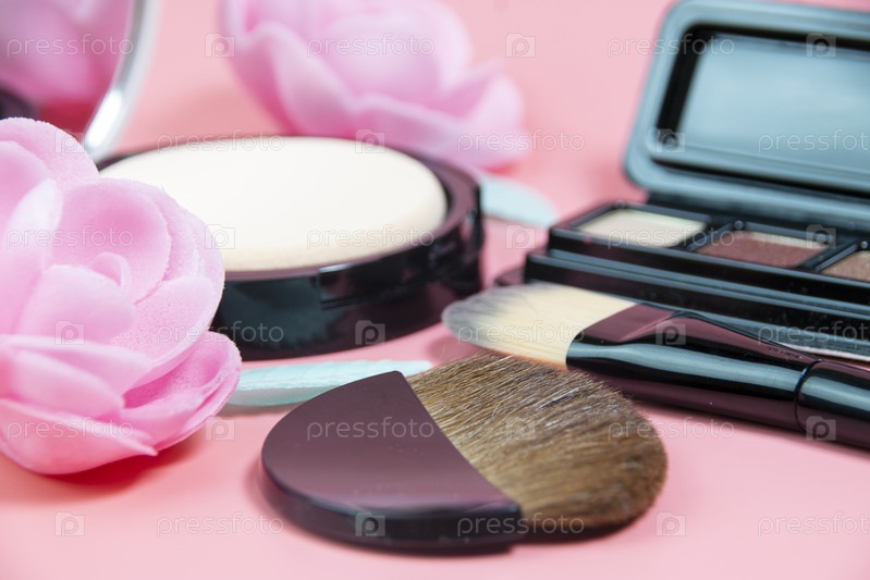 Натюрморт с декоративной косметикой и розовыми цветами