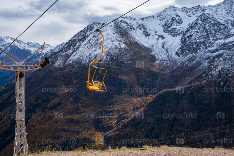 Горный пейзаж с движущимся креслом одноместной канатной дороги