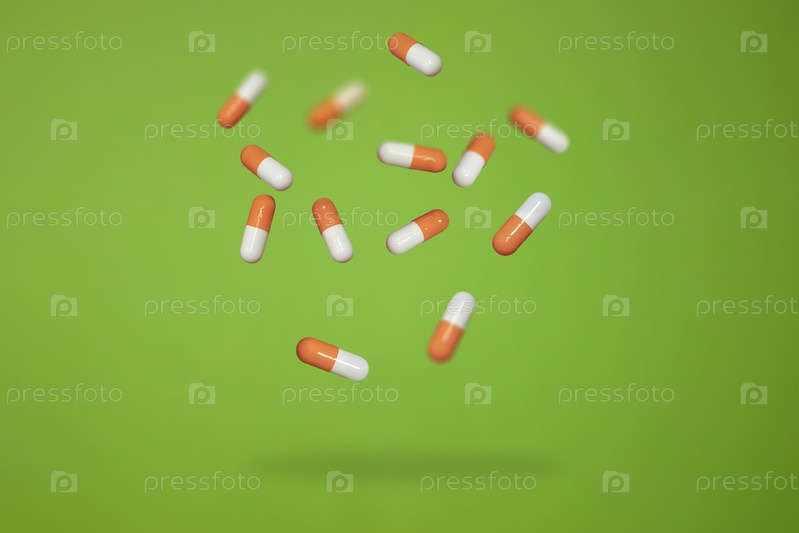 Оранжевые и белые капсулы с наркотиками расположены в центре зеленого фона