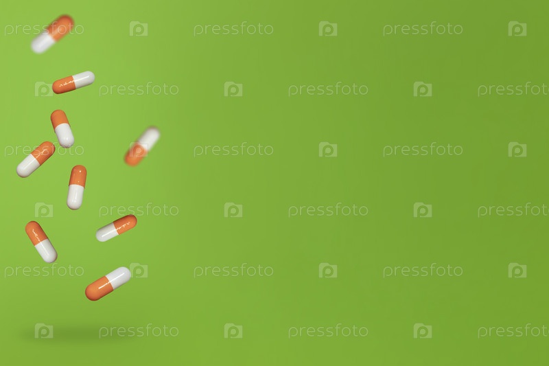 Оранжевые и белые капсулы медицины на зеленом фоне